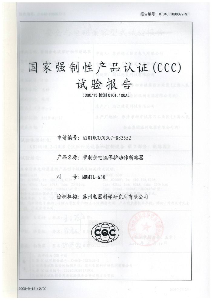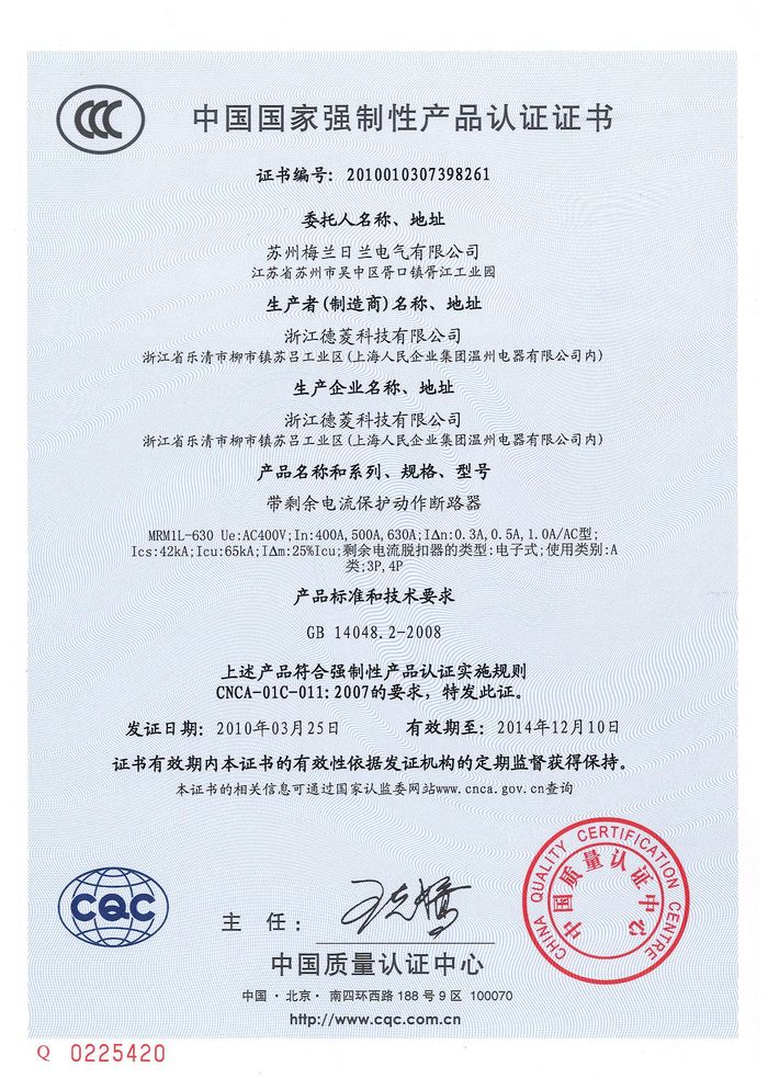MRM1L-630塑殼漏電資質證書