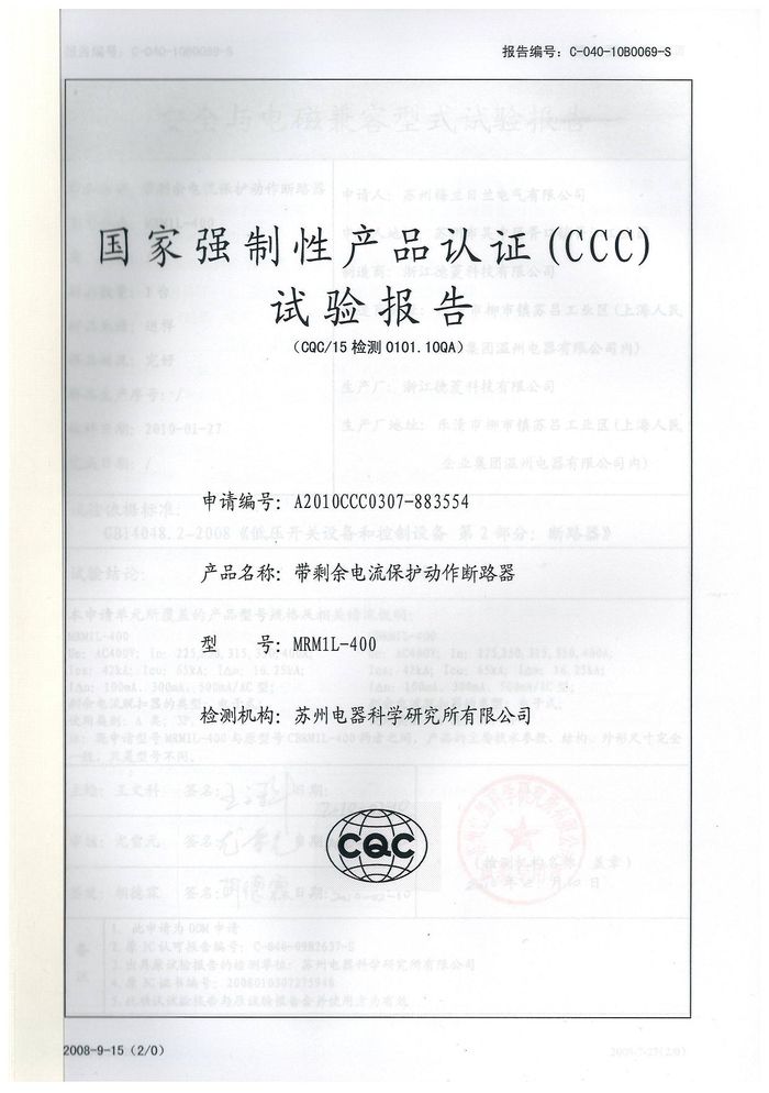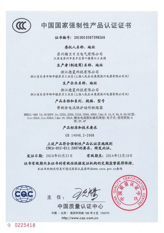 MRM1L-400塑殼漏電資質(zhì)證書(shū)