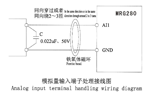 在某些模擬信號受到嚴重干擾的場合,模擬信號源側需加濾波電器或鐵氧體磁芯,如下圖