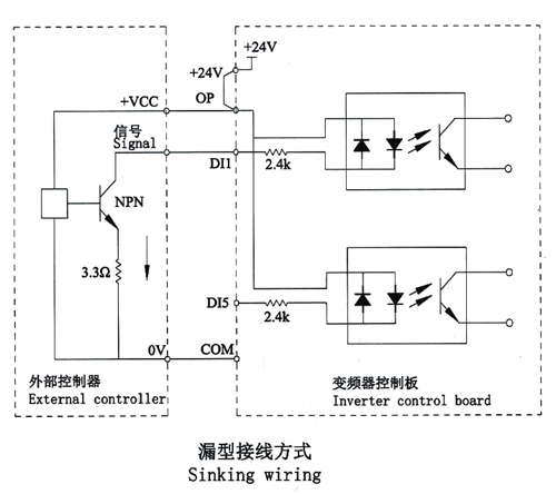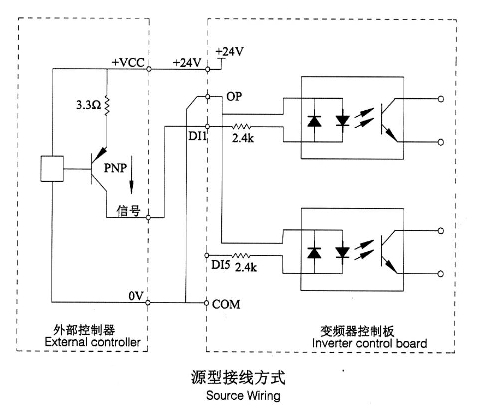 這是一種最常用的接線方式。如果使用外部電源,必須把+24V與OP間的短接片去掉,把外部電源的24V正極接在OP端子,外部電源OV經控制器控制觸點后接到相應的Dl端子。