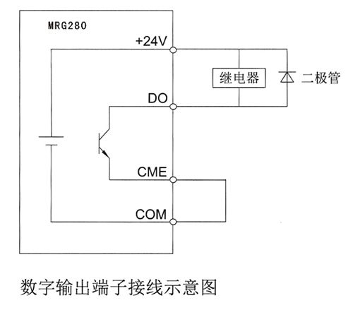 注2:數(shù)字輸出地CME與數(shù)字輸入地COM是內部隔離的,但出廠時CME與COM已經外部短接(此時D01默認為+24V驅動)。當D01想用外部電源驅動時,必須斷開CME與COM的外部短接。